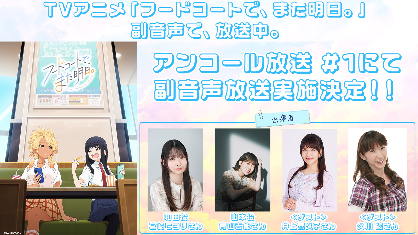 インキャストの宮崎ヒヨリさん、青山吉能さんに、ゲストで「永遠の17歳」井上喜久子さんと久川綾さんをお迎えし、各局アンコール放送の第1話に合わせて、4人で第1話を視聴している副音声を放送いたします。